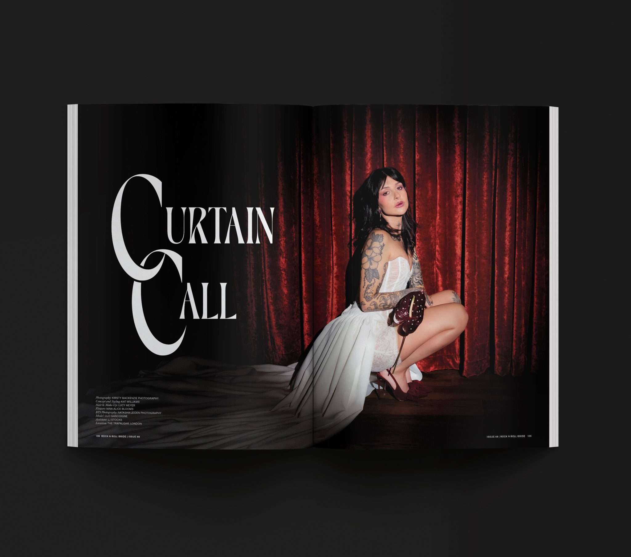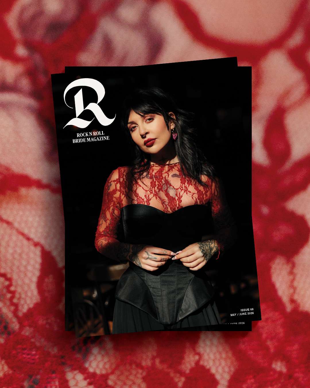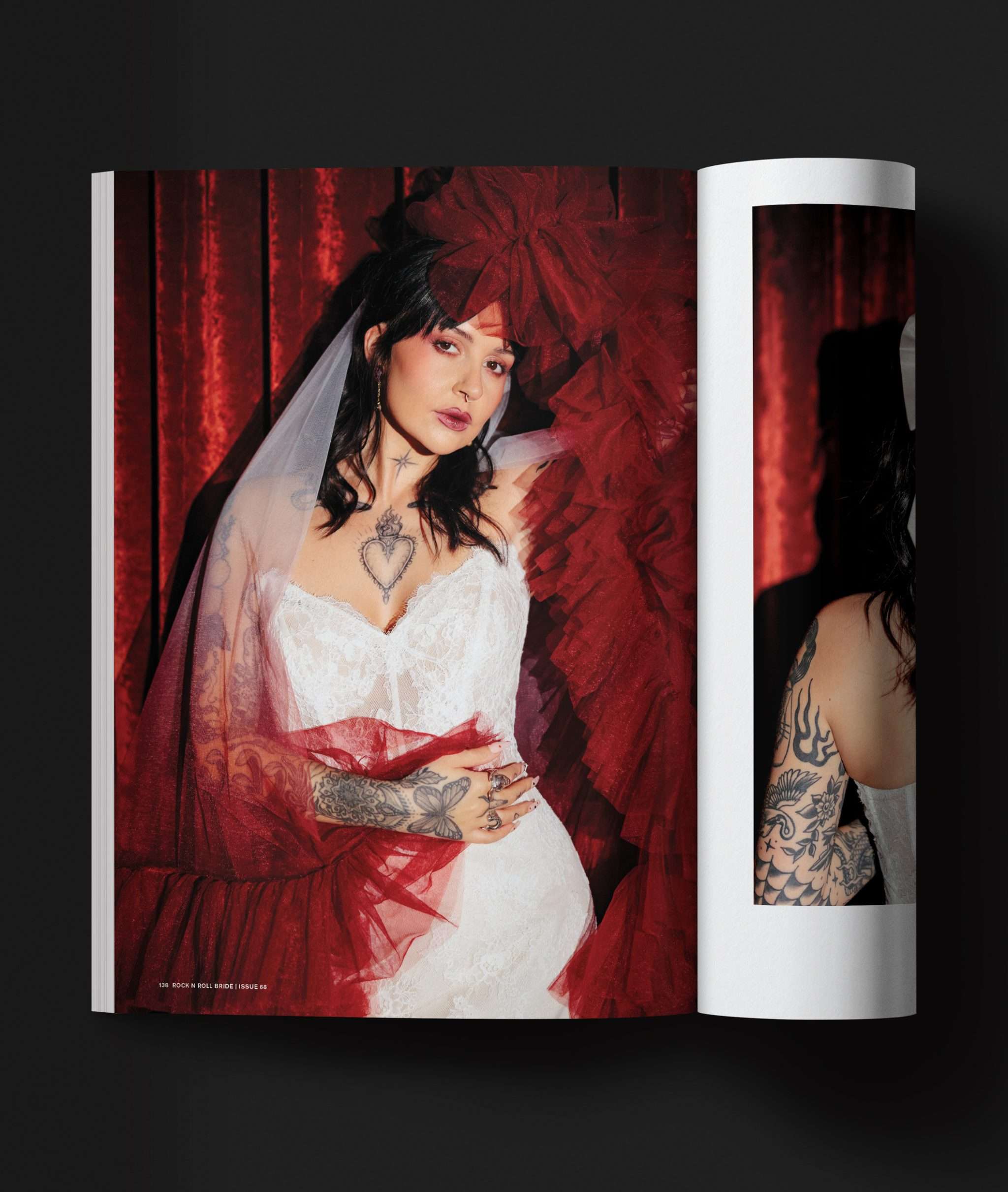 For this issue, I wanted something that felt classic Rock n Roll Bride - tattooed model, chunky jewellery, a black, white and red palette - but with a nod to more traditional bridal styling through lace and corsetry. They’re classics for a reason. If anyone dares ask what you’re going to look like with “all those tattoos”, feel free to throw a copy of this issue in their direction!